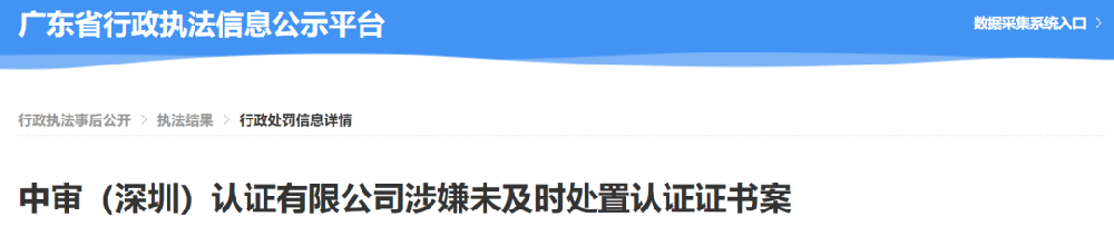 案件名稱:中審(深圳)認(rèn)證有限公司涉嫌未及時處置認(rèn)證證書案